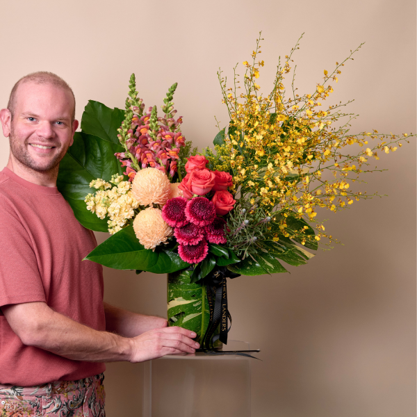A tropical inspired, structured design of premium Summer florals, with a nod to beautiful Australian Grown botanicals. This design is arranged and presented in a premium, ceramic vessel.