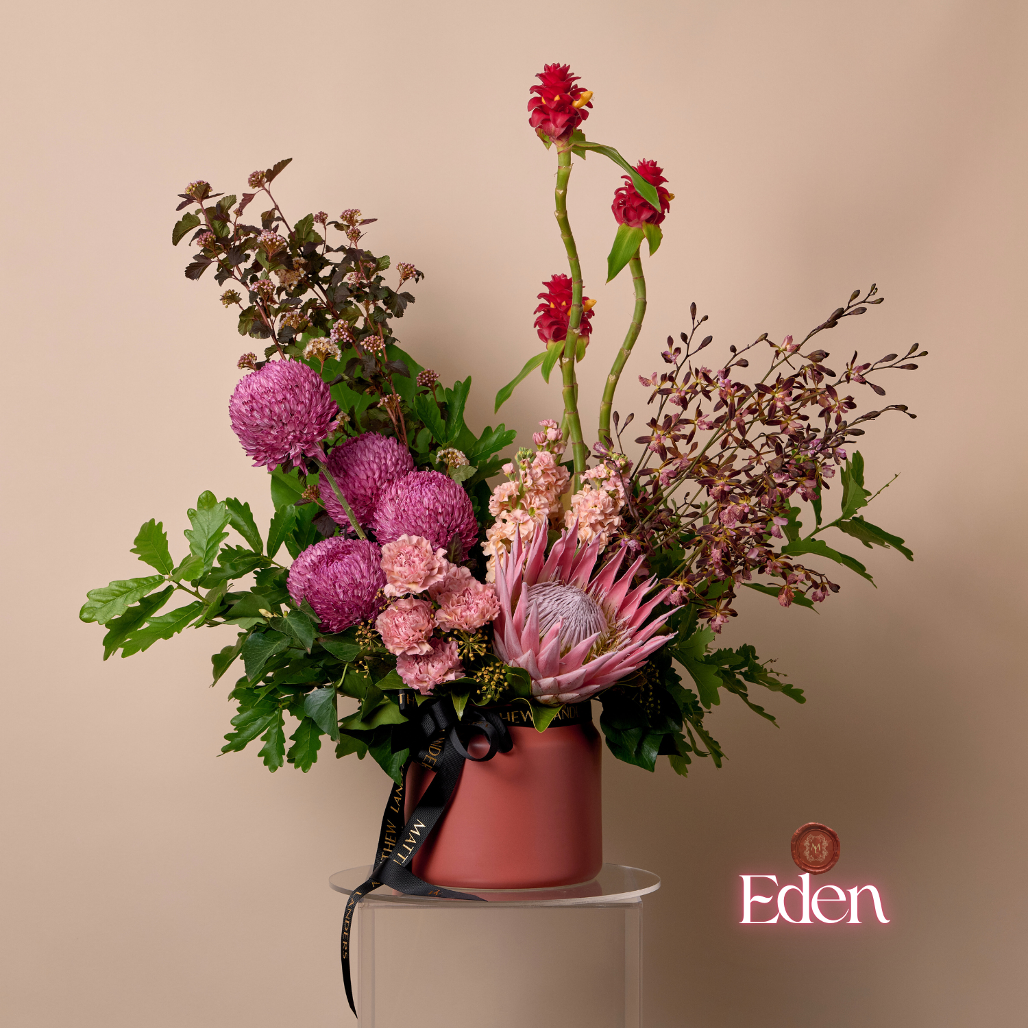 A more whimsical, yet structured design of premium Summer florals, with a nod to beautiful Australian Grown botanicals. This design is arranged and presented in a premium, ceramic vessel.