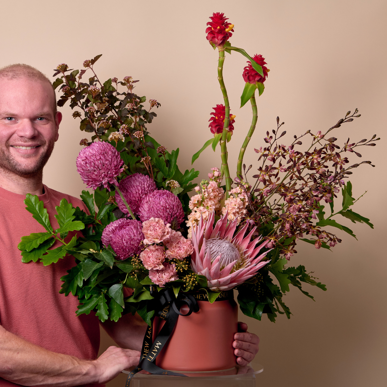 This design features our best, seasonal botanicals to suit the colour palette and value chosen. The size and scale of the vase is chosen to suit the value.