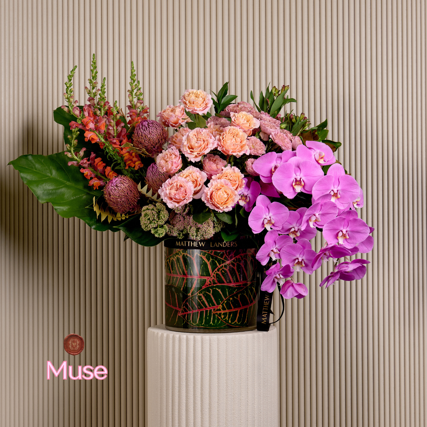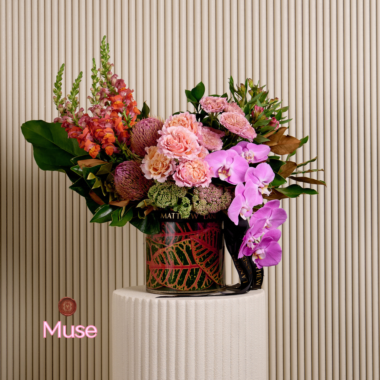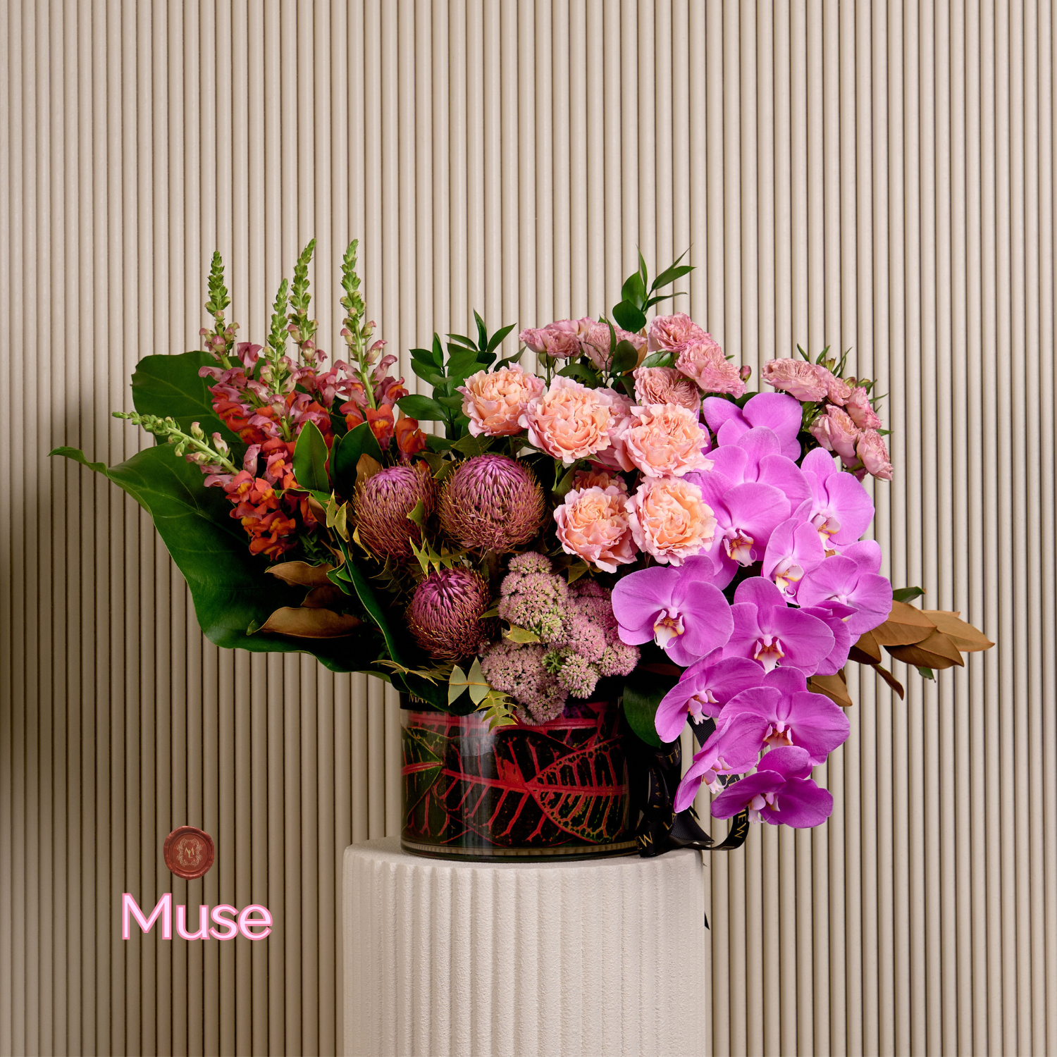 A bold, structured vase design of premium Autumnal florals with sculptural foliage accents. This design includes local and farfetched treasures and is arranged and presented in a premium, glass vase.