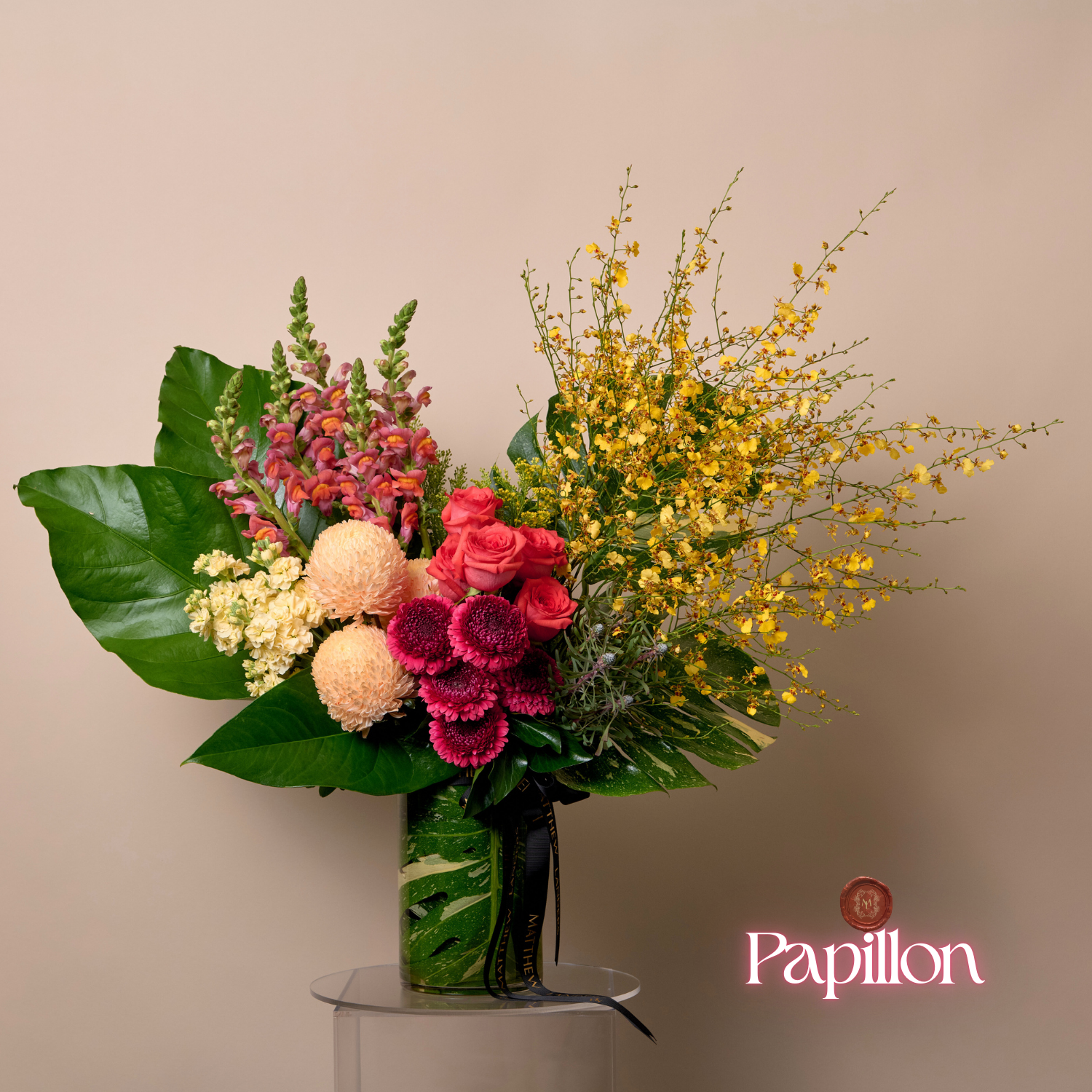 A striking, shapely design of luxe, premium Summer seasonal blooms. This design arranged and presented in a premium, glass vase.
